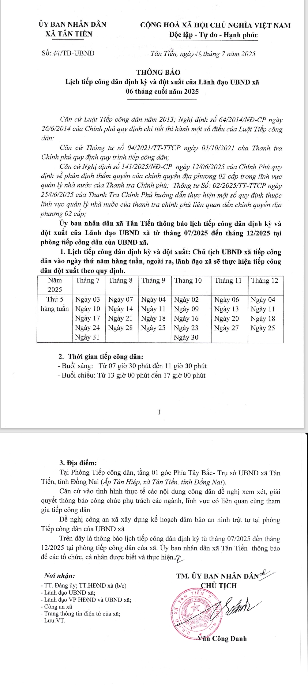 THÔNG BÁO VIỆC TỔ CHỨC TIẾP CÔNG DÂN ĐỊNH KỲ VÀ ĐỘT XUẤT TẠI XÃ TÂN TIẾN 6 THÁNG CUỐI NĂM 2025